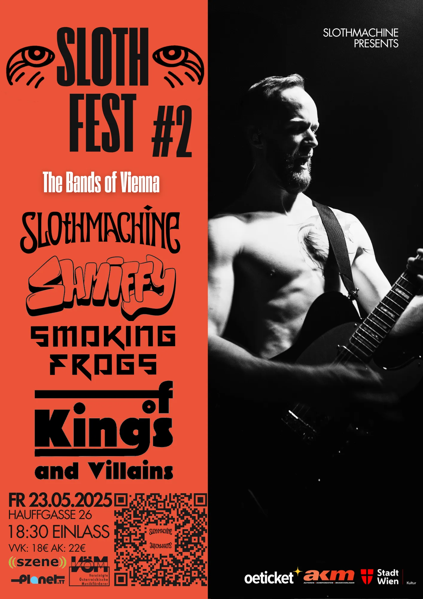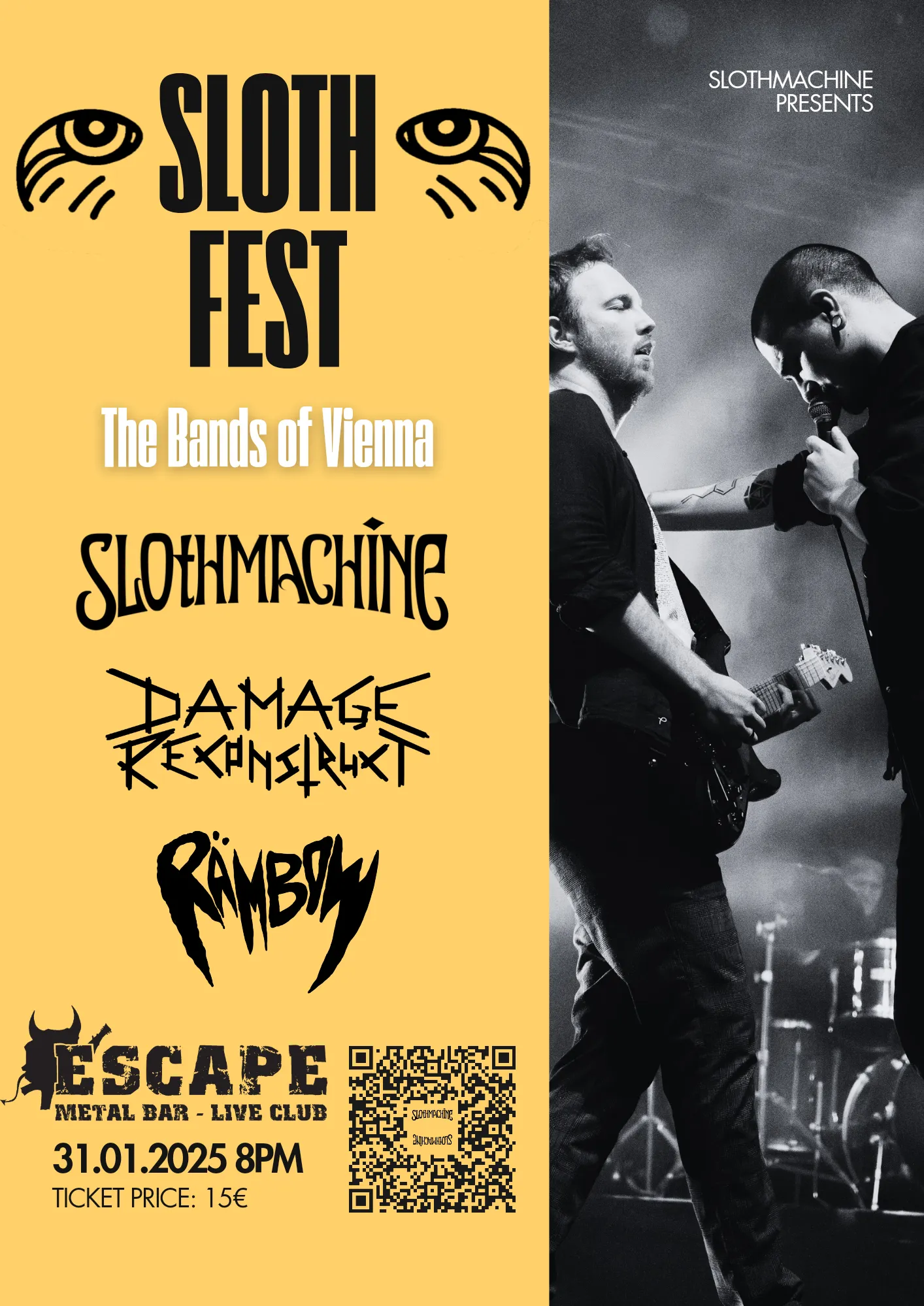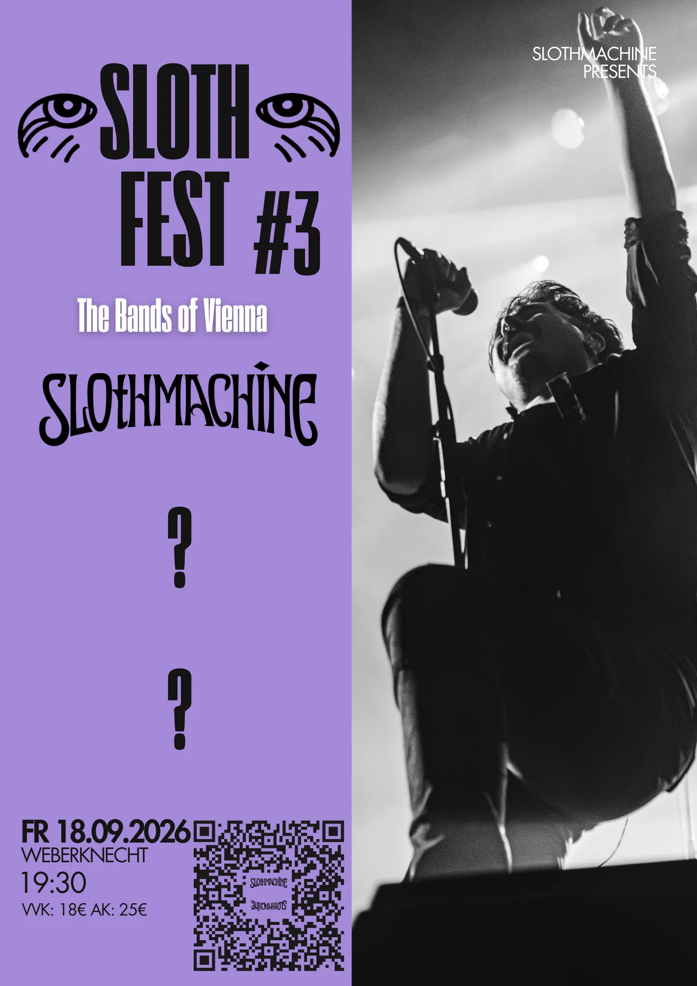 Slothmachine stands for a united, self organized band scene, without corporate greed, deranged artificial intelligence art and exploitation. Long gone are the times of readily available paid gigs, thriving local venues and untainted artistry in the city of music. We know that systematic, revolutionary change is necessary to rebuild the environment for true artistic expression. Yet the nucleus of this movement is already built in the old, rotten world. We call on all artists to unite against this so called culture of Pay For Play, Ticket Ponzi Schemes and catering to “The Middle Man”.